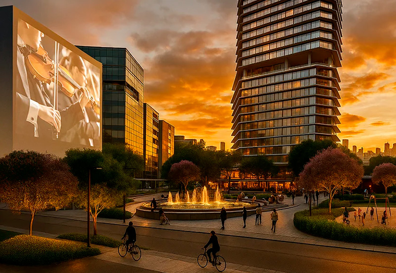 Com edifícios de uso misto, comércio de rua nos andares térreos e calçadas largas, com 11 metros de largura, a ideia é promover a vida em comunidade, com prioridade ao pedestre, permitindo que crianças cheguem à escola a pé e que os mais de 50 mil metros quadrados de parques, praças e passeios sejam palco de atividades culturais, esportivas e gastronômicas. Um Concert Hall de nível internacional, um colégio particular, um centro médico e um supermercado são alguns dos atrativos já garantidos no projeto.