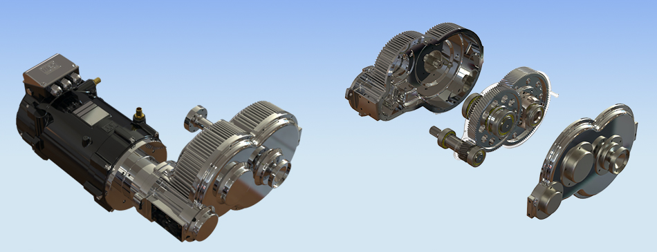 O EletroRedutor com as engrenagens à mostra e acoplado ao motor: maior autonomia e economia de bateria para veículos elétricos - Foto: Divulgação