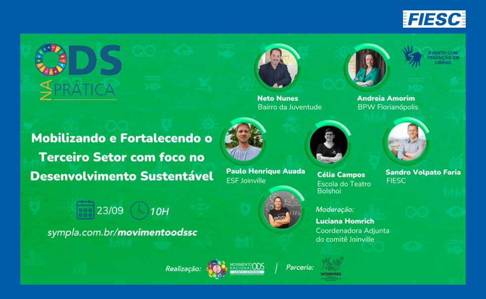 Florianópolis, 21.9.2021 - A Federação das Indústrias (FIESC) participa nesta quinta-feira (23) de painel promovido pelo Movimento Nacional ODS Santa Catarina como parte da programação da Semana ODS na Prática 2021. Entre as ações realizadas pela entidade que serão destacadas no encontro estão o Movimento Santa Catarina pela Educação, que em seu novo ciclo tem foco na recolocação de profissionais qualificados no mercado de trabalho, e o Fundo Social, uma ação articulada pela FIESC com o objetivo de promover a cultura do uso dos incentivos fiscais em Santa Catarina. O painel tem transmissão ao vivo, a partir das 10 horas, pelo YouTube.