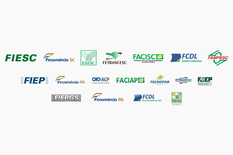 documento é assinado pelas Federações das Indústrias (FIESC, FIEP e FIERGS), do Comércio (Fecomércio/SC, Fecomércio/PR e Fecomércio/RS), da Agricultura (FAESC, FAEP e FARSUL), dos Transportes (Fetrancesc e Fetranspar), das Câmaras de Dirigentes Lojistas (FCDL/SC e FCDL/RS), das Associações Empresariais (FACISC e FACIAP), além da Associação Comercial do Paraná (ACP), e da Federação e Organização das Cooperativas do Paraná (Fecoopar).