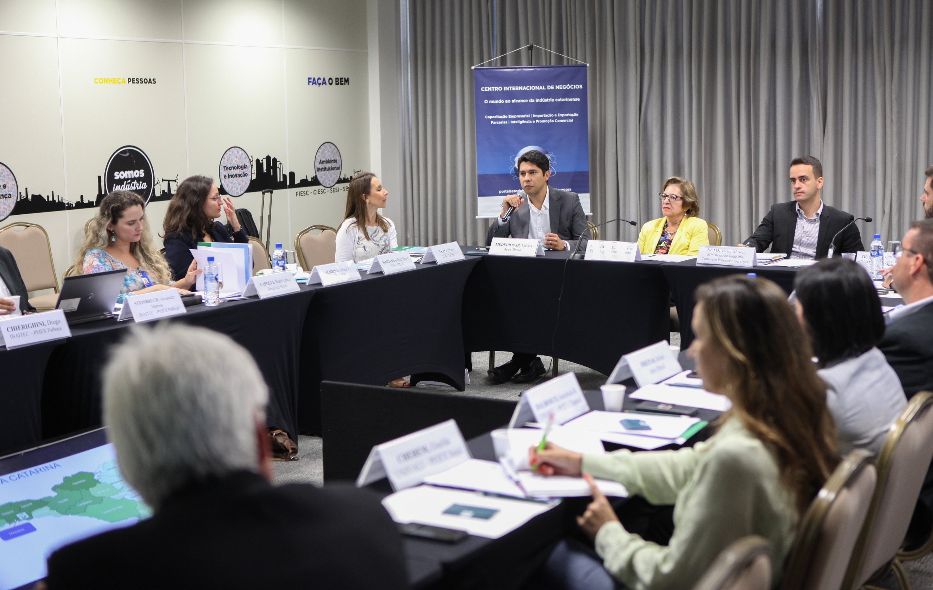 Florianópolis, 18.4.2018 – Lideranças do Ministério do Desenvolvimento, Indústria e Comércio (MDIC), da Apex-Brasil, do governo do Estado, de universidades e instituições ligadas ao comércio exterior reuniram-se na FIESC nesta quarta-feira (18) para tratar do Plano Nacional da Cultura Exportadora (PNCE) e do Programa de Qualificação para Exportação (PEIEX).