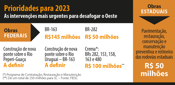 No caso das rodovias federais, a necessidade total de investimentos é de R$ 600 milhões, mas a FIESC definiu uma lista de prioridades para 2023 que envolvem valores de R$ 300 milhões. Para Saporiti, é urgente contemplar os trechos entre Chapecó e São Miguel do Oeste (BR-282) e entre Maravilha, Cunha Porã e Palmitos (BR-158 e SC-283).