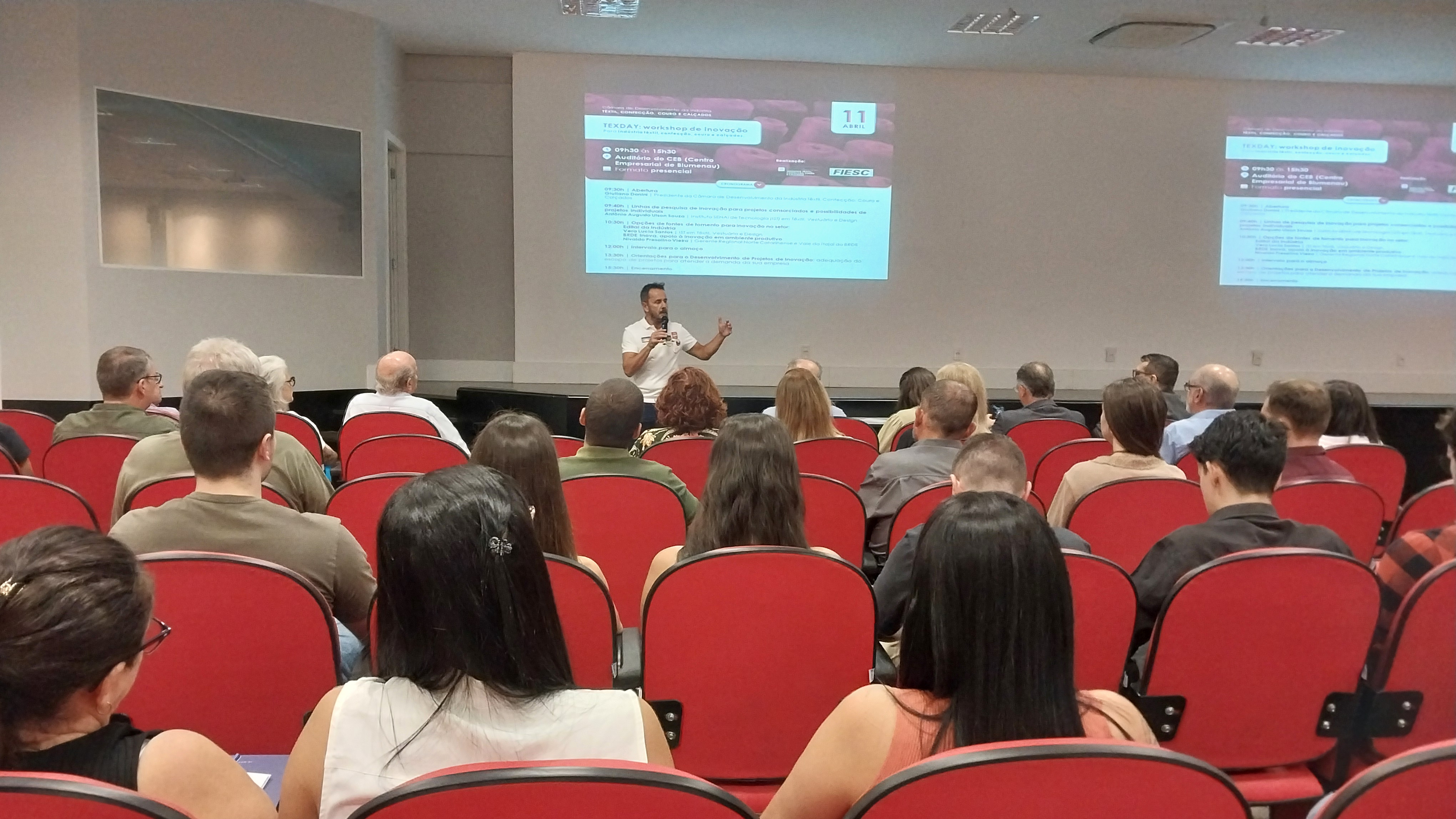 Blumenau, 11.04.2024 - Os setores da cadeia da moda, tradicionalmente grandes empregadores da indústria catarinense, precisam se preparar para fazer frente a desafios como a transformação digital e a economia circular. Nesse sentido, é essencial que as micro, pequenas e médias empresas - que compõem 97% do número de negócios no segmento - tenham acesso a inovação. Esse foi o tom do TexDay: Workshop de Inovação promovido pela Câmara de Desenvolvimento da Indústria Têxtil, Confecção, Couro e Calçados da Federação das Indústrias de SC (FIESC) nesta quinta-feira (11) em Blumenau.