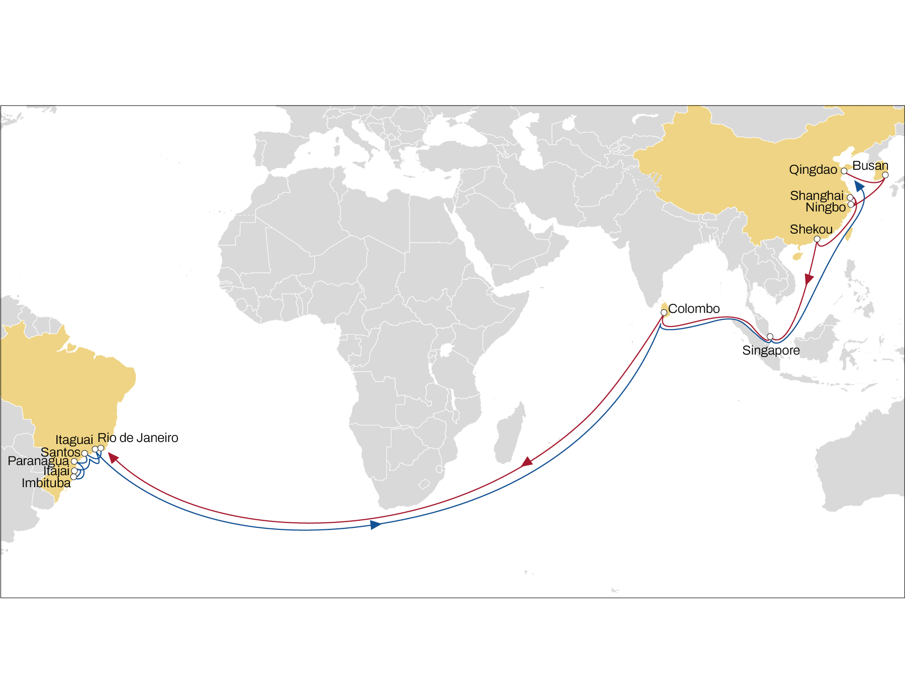 Qingdao – Busan – Ningbo – Shanghai – Shekou – Singapore – Colombo – Rio de Janeiro – Santos – Paranaguá – Imbituba – Itajaí – Santos – Itaguaí – Colombo – Singapore – Qingdao