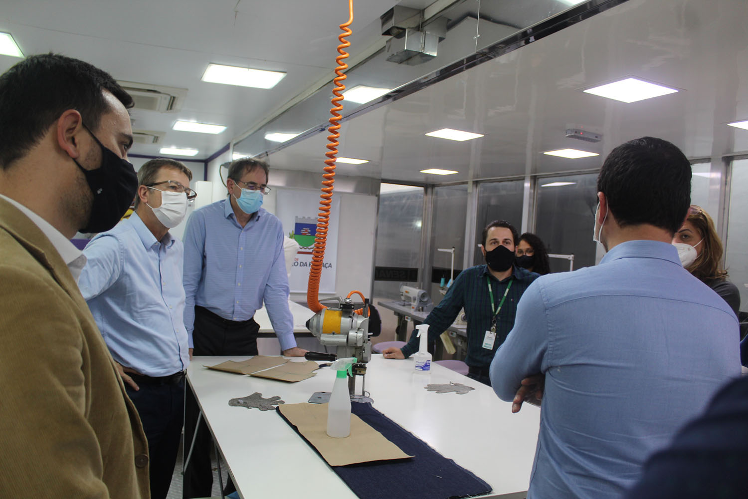 Já a unidade móvel de confecção industrial possui 25 máquinas de costura, do tipo overloque, galoneira, reta e para operações especiais, mesa de corte com a cortadora de tecido e todos os equipamentos necessários para a produção de roupas.