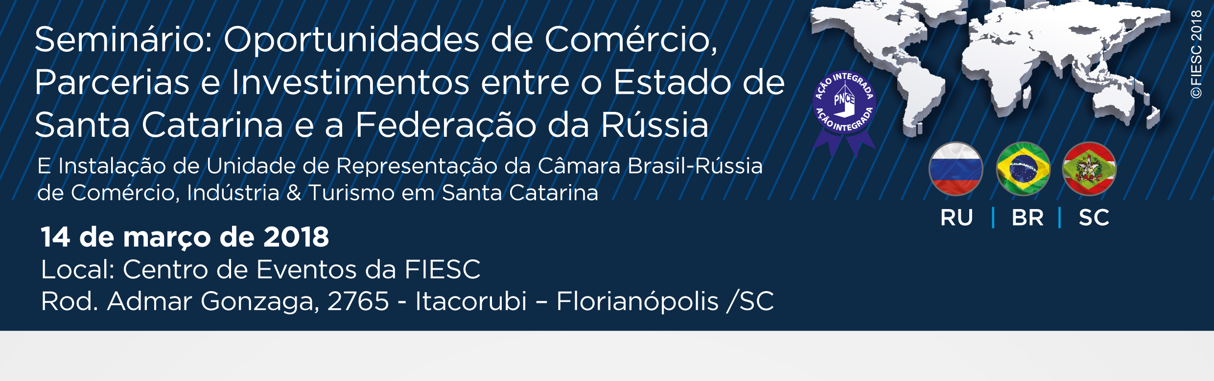 Florianópolis, 8.3.2018 – A FIESC promove no dia 14 de março, das 9h às 14h, em Florianópolis, seminário para debater oportunidades de negócios e parcerias com a Rússia. O encontro é organizado em parceria com a Câmara Brasil-Rússia de Comércio, Indústria e Turismo e a Nemetz & Kuhnen Advocacia. Entre os palestrantes previstos estão: o embaixador da Rússia no Brasil, Sergey Pogossiovitch, o presidente da Câmara Brasil-Rússia, Gilberto Ramos, e o presidente da Associação Brasileira de Proteína Animal (ABPA), Francisco Turra. Clique aqui e veja a programação.