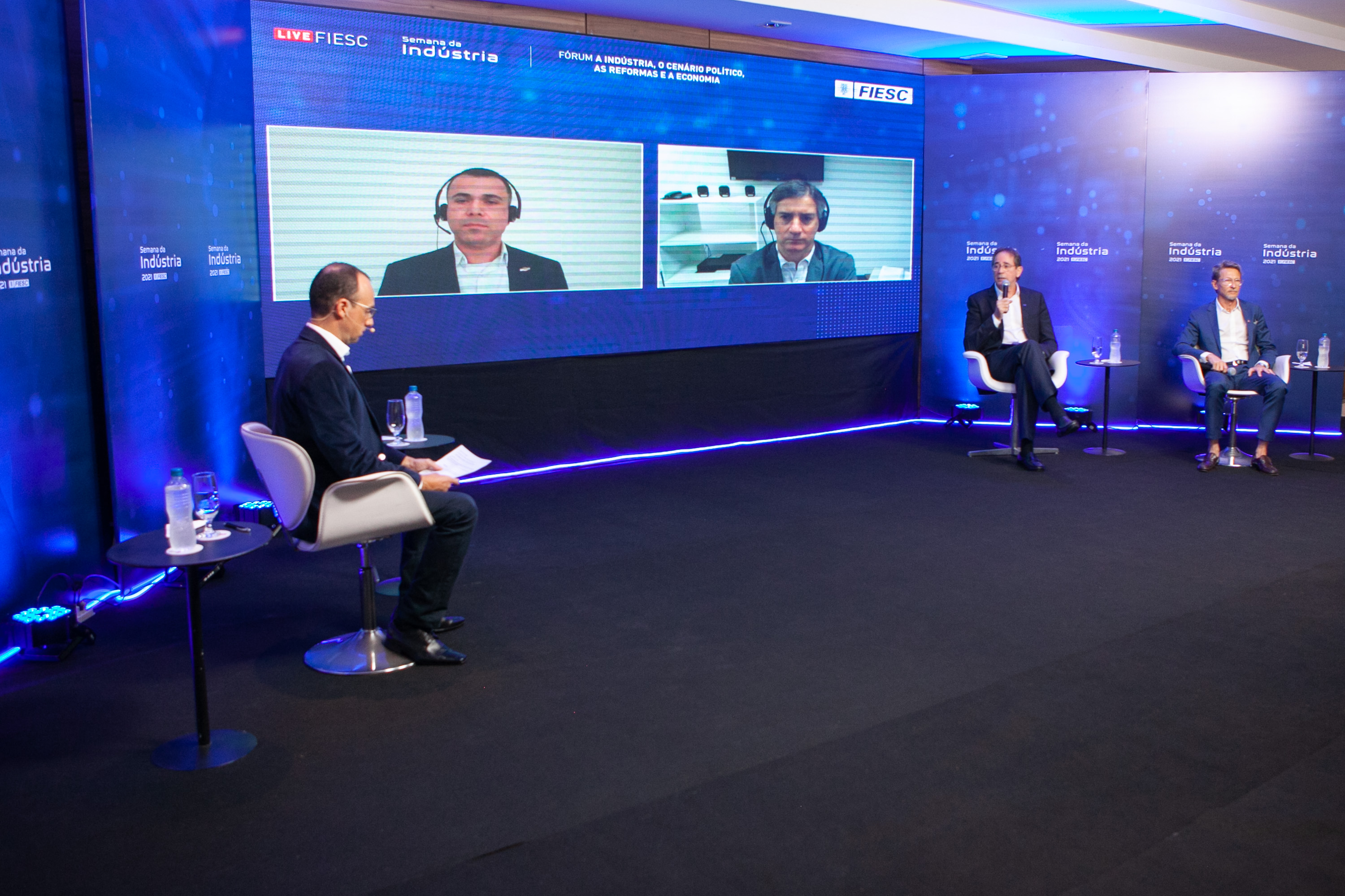 Florianópolis, 27.5.2021 - “Precisamos unir forças para aprovar a reforma tributária ampla. Só ela tem a capacidade de acelerar o crescimento econômico do país. É nesse sentido que estamos trabalhando. Todos os estudos mostram que a reforma ampla, envolvendo o ICMS e o ISS, tem a capacidade de acelerar o crescimento”, afirmou o gerente de política econômica da CNI, Mário Sérgio Telles. Ele debateu o assunto em painel que também teve a participação do presidente da Holding GBGA, Luiz Gonzaga Coelho; do diretor de relações públicas e governamentais da GM, Adriano Barros, e do presidente da Federação das Indústrias (FIESC), Mario Cezar de Aguiar. A reforma ampla foi consenso entre os painelistas, que estiveram nesta quinta-feira, dia 27, no terceiro dia de eventos da Semana da Indústria, promovida pela FIESC.